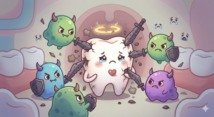 お口の中の細菌(ミュータンス菌など)は、この高濃度の砂糖をエサにして強力な「酸」を作り出すため、私たちの歯を溶かしてしまいます。
