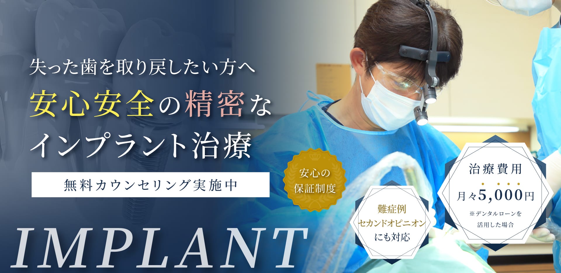 インプラントは保険適用外の治療です。術後疼痛や腫れが生じる場合があります。